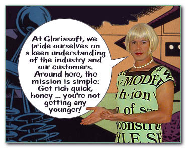 "Gloriasoft will be held accountable to the investors, particularly the well-endowed ones, and will strive to remain competitive without sacrificing any of Gloria Sadowski's benefits, including her chateau in N”ce, her Faberge collection, or the chocolate pumps she got during Wigstock. "Gloriasoft will meet all reasonable expectations of the customer, with emphasis on the reasonable part, as Gloriasoft has no intention of refunding monies, handling technical support issues related to asinine user errors, or taking any crap from litigation-happy computer geeks who think they know more than I do, damnit! "Sorry. "I got carried away. "Um, Gloriasoft will break the mold when it comes to technical excellence and delivering service. OK, I'm done."